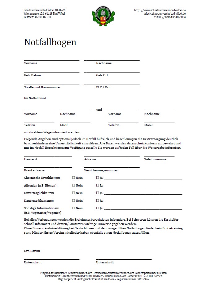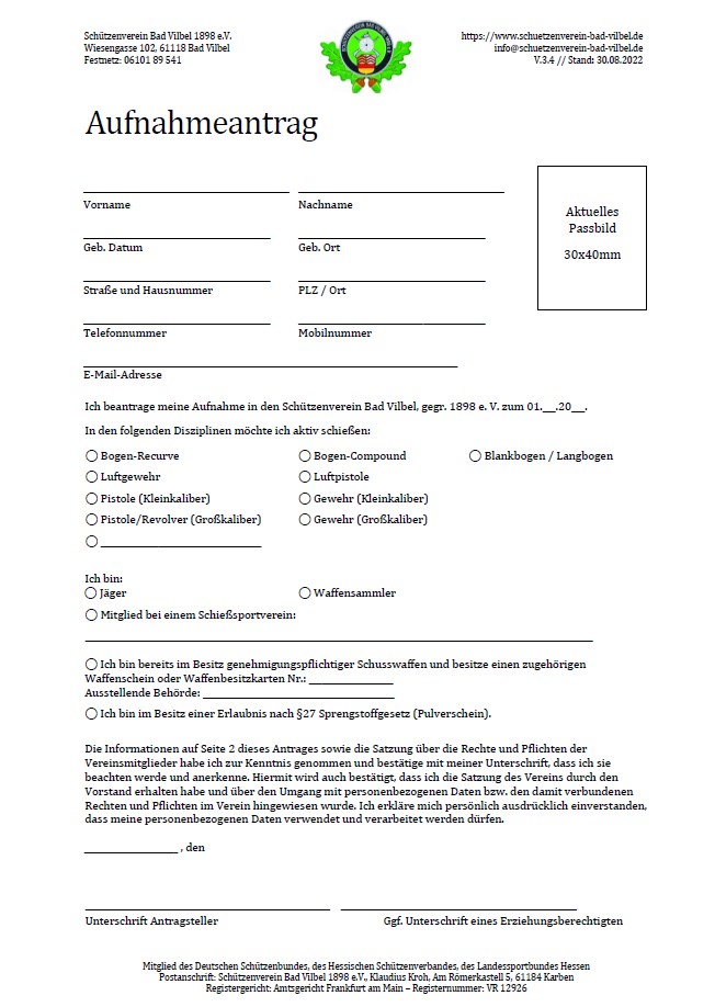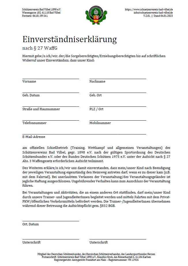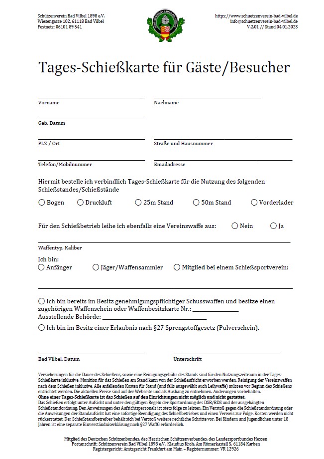 Gäste, Besucher und Mitglieder ohne Jahres-Schießkarte bringen diese bitte ausgefüllt zum Schießen mit.